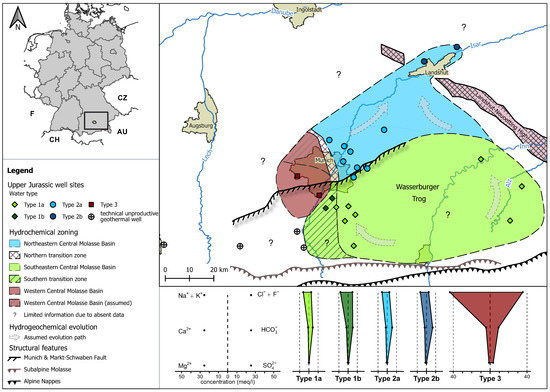 - The connate Upper Jurassic formation water was washed out of the aquifer. The low mineralised groundwater in the central SGMB was believed to be a mixture of meteoric water and higher mineralised formation or oil field waters, presumably seeping from the overlying Tertiary sediments, which are responsible for the higher and dominating amounts of sodium and chloride [2,24,25,29,31,33,37,38,56]. Subsequently, on the basis of the assumed geochemical evolution of the Upper Jurassic groundwater in the central SGMB, it was assumed that the groundwater flows from west to south-east towards the Alps [37];