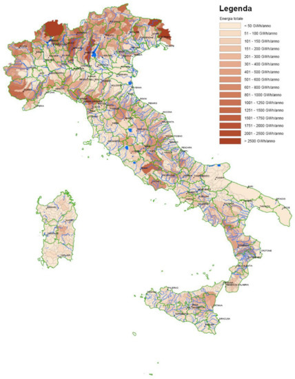 Map of maximum annual hydroelectric production in Italy (Source: ERSE SpA, https://www.erseambiente.it/, accessed on 15 April 2021).
