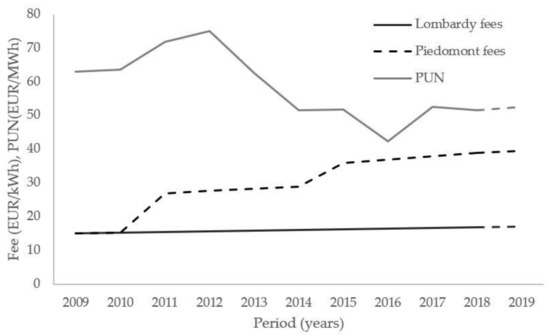 One of the main concerns regarding the economic sustainability of hydroelectric plants in Italy is that while the average energy price is constantly decreasing (i.e., about 20% less than that in 2012), the sum of the water concession fees/surcharges continues to rise; in some regions there was an increase in taxes related to the use of water resources by local authorities by almost 160% [23]. Figure 2 shows the growing trend of water concession fees in recent years for the two regions “at the extreme” as regards the values for small plants in comparison to the national single price (PUN). After the peak of 2012, the PUN went down (−17% overall from 2009 to 2018), while the water concession fees, especially in Piedmont, increased significantly (+159% from 2009 to 2018). The increase in Lombardy is less marked and more gradual (+12% in the period 2009–2019). The trend is rather disconcerting, considering that the fees are fixed costs for the hydroelectric operator and are not related to either the economic value of production or actual water availability [23].