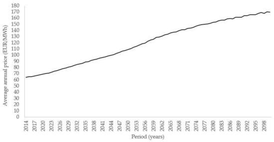 Trend of average annual prices of electricity over the period 2014–2100 [3,4].