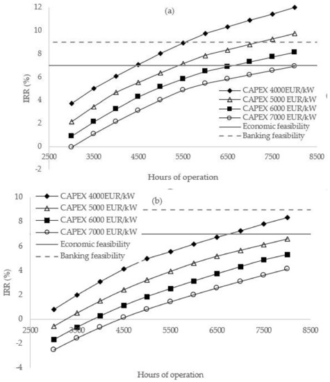 Feed in tariff vs. hours of operation for different capital expenditure values in order to reach internal rate of return of 7% (a) and 9% (b); plant size is 500 kW.