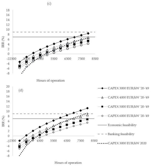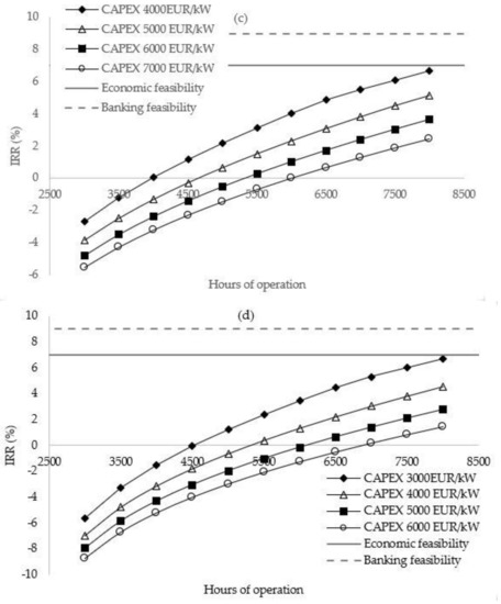 The IRR of the investment is less than 7% for almost all cases, except the first. The rate worsening as the size increases is substantially due to the lesser relevance of the PMG provided for plants with a concession power less than 1000 kW, within the first 1,500,000 kWh produced. Only the smaller plants can take advantage of these subsidized prices for all the produced energy, while the larger ones must operate mainly on the market price. As shown in Figure 4, a 100-kW system is the only interesting one: it achieves a threshold of acceptability for a CAPEX of 4000 EUR/kW, 5000 EUR/kW and 6000 EUR/kW respectively after 4500, 5500 and 6500 h. For plants with an installed power of 250 kW, the area of acceptability is only slightly crossed with a CAPEX of 4000 EUR/kW. Systems with the most expensive installation costs (CAPEX equal to 6000 and 7000 EUR/kW) achieve a very low IRR. When a plant exceeds 5,000,000 kWh of energy production, according to PMG 2019, the price of energy undergoes a sharp decrease of approximately 37%, from 107.2 to 67.6 EUR/MWh. The cash flow is therefore gradually reduced as the production and consequently also the IRR increase. As shown in Figure 4c,d, the situation worsens for plants of 500 and 1000 kW, as these can reach very high productions, of about 3,000,000 and 7,000,000 kWh, respectively. In such cases, the effort to use substantial resources for development is not rewarded at all by the high productions because the subsidized tariff plan does not reward them. The simulation concerning the 1000 kW system has the lowest CAPEX, i.e., between 3000 and 6000 EUR/kW, in order to consider the scale factor; unit installation costs that are too high would lead to a hugely unreliable investment. The rents (in which royalties are also considered) have a strong impact on the profitability of the plant: these represent an average annual cost equal to approximately 6% of the revenues for a 100 kW plant, also exempt from the payment of mountain watershed and local authorities, between 9% and 12% for a 250 kW plant, between 15% and 17% for the 500 kW case, and between 19% and 22% for a 1000 kW system. If incentive tariffs on the same cases were applied, any plant size would become economically sustainable, even hitting profitability peaks of over 25%. Figure 5 shows results for the following incentives: 0.219 EUR/kWh for 250 kW plants (Figure 5a), 0.179 EUR/kWh for 500 kW plants (Figure 5b), and 0.1561 EUR/kWh for 1000 kW plants (Figure 5c). To consider the scale factor, the rate was discounted as the size increases. Despite this, all lines intersect the areas of acceptability and convenience.
