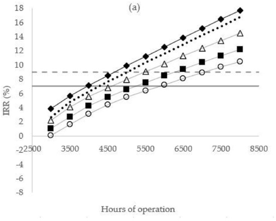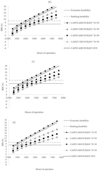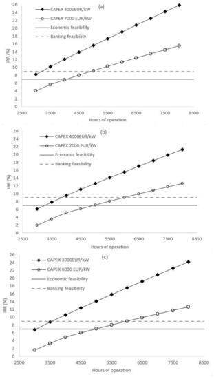 Internal rate of return vs. hours of operation for plants of 250 kW with an incentive of 0.219 EUR/kWh (a), 500 kW with an incentive of 0.179 EUR/kWh (b), 1000 kW with incentives of 0.156 EUR /kWh (c).