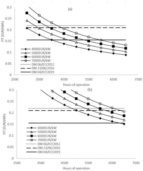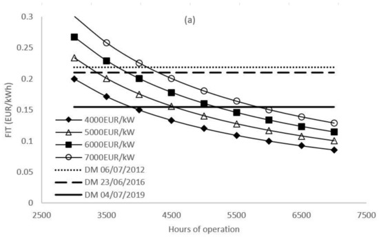 The current FIT (DM 4th July 2019) is suitable for guaranteeing a net economic return of 7% but not to reach 9%, while the FIT of DM 6 July 2012 and DM 23 June 2016 would be sufficient for both profitability thresholds. The FIT to reach an IRR of 7% and 9%, when averaging the values associated with the various CAPEX values and assuming 6000 h of operation, would be 0.129 EUR/kWh and 0.208 EUR/kWh, respectively.