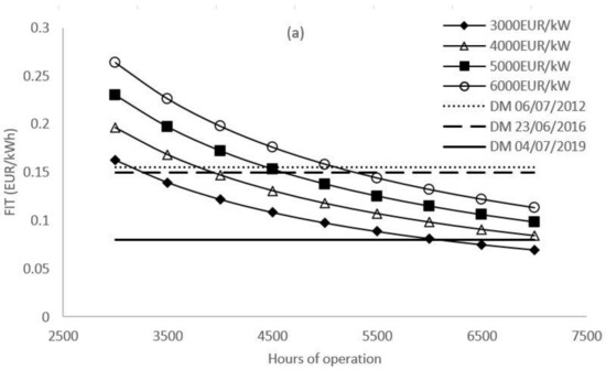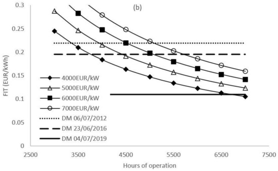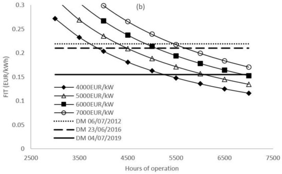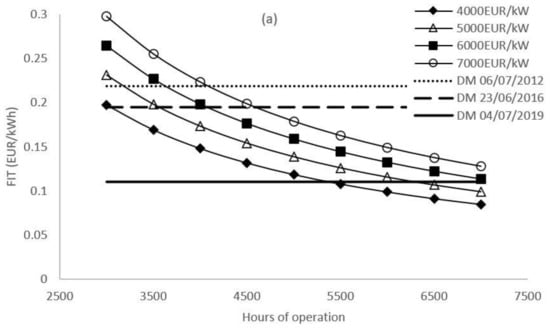 For 1000 kW systems, the FIT provided by the DM 4 July 2019 is insufficient to guarantee an economic sustainability of 7% and 9% (Figure 10). On the contrary, the FIT established by the previous ministerial decrees, i.e., DM 6 July 2012 and DM 23 June 2016, would be sufficient for both profitability thresholds. The FIT to reach these profitability thresholds, when averaging of the values of different CAPEX and assuming 6000 h of operation, would be 0.107 EUR/kWh and 0.127 EUR/kWh, respectively. With the FIT guaranteed by the DM 23 June 2016, almost all plants reach acceptable yields at around 6000 h of operation, unlike that with the last tariff plan (DM 4 July 2019). Only systems with installed power less than or equal to 250 kW (for any CAPEX) and those of 500 kW for small CAPEX (about 4000 EUR/kW) guarantee the minimum profitability of 7% when calculating for the same number of operating hours. All other combinations do not guarantee the achievement of minimum economic sustainability. Table 5 summarizes the values of the FIT resulting from the analysis.