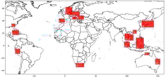 Locations of the 18 regions used for comparative study on the global map.