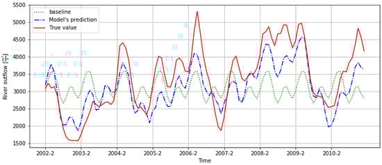 Our baseline-naïve model is a strictly periodic, stationary model with no trend. For each of 12 months, the respective mean value is calculated from the training set. When asked for a prediction for a given month, the model returns the respective mean value, disregarding any other features. The predictions of this model are thus identical for all years (for a given training period). Notice that this is the only model considered in this study that uses the historical values of river runoff to determine the value of the dependent variable—all remaining methods use the climate indices only.