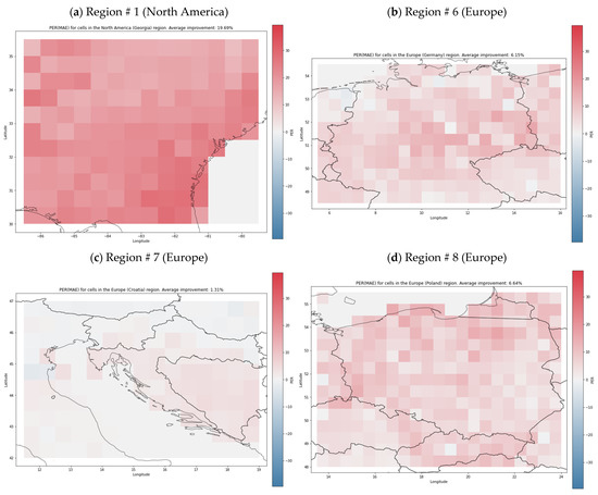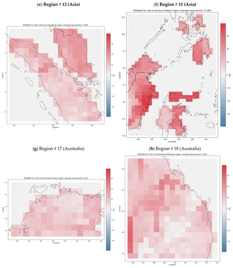 Figure 4 presents the heatmaps that visualize the spatial, per-cell distribution of PER (MAE). We focused on MAE because of its good interpretability, and for brevity present a representative sample of eight regions, in North America (Figure 4a; region #1, including Georgia, USA); Europe (Figure 4b–d; region #6, including Germany; #7, including Croatia; and #8 including Poland), Asia (Figure 4e,f; region #12, including Singapore, and #15, around the Celebes Sea), and Australia (Figure 4g,h; region #17, including Darwin, Northern Territory, and #18, including Brisbane, Queensland). The shades of red represent the degree of improvement of the neural model with respect to the baseline, and the shades of blue indicate the signal deterioration. The heatmaps suggest that, at least for some regions, there seems to be a meaningful link between independent variables and the river runoff. A particularly strong signal model was synthesized for region #15 (Figure 4f), where the average value of PER (MAE) was 22.5, the largest among the considered regions (Table 2). We hypothesized that this may have stemmed from this region being located in the zone of potential strong influence of ENSO.