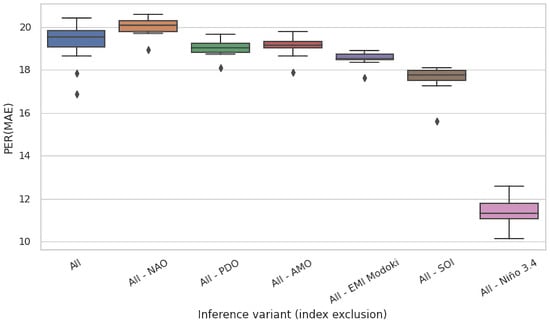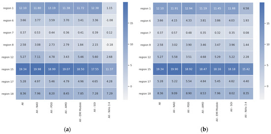 Given the mutually complementary advantages of these ablation techniques, we conducted both of them. In Figure 5a,b, we present the results for the eight selected regions of interest for test time and training time ablations, respectively. Both figures present the PER (MAE) metric for the original, non-ablated model M in the leftmost column (All), and for the ablated configurations in the successful columns (All–NAO, All–PDO, etc.). Each cell in these heatmaps summarizes the test-set PER (MAE) of 11 models in an 11-fold cross validation experiment conducted on 110 years of available data partitioned into 11 decades, as described in Section 3.3.