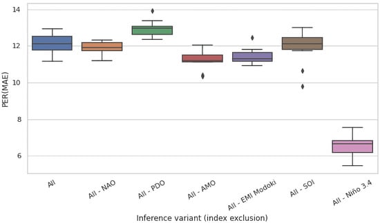 The Nino index clearly stood out in this analysis: its absence never improved PER (MAE), and the incurred loss in comparison to all-variables scenario (All) was typically substantial. This suggests that Nino was an essential determinant for prediction of river runoff for all eight regions of interest spread across the globe.