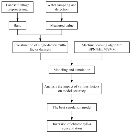 In this study, a series of models are built by combining multiple datasets and BPNN, ELM, SVM. The impact of various factors on model accuracy is analysed to study the best condition for modeling. In addition, the model with best simulation effect is used for the inversion of chlorophyll-a concentration in Donghu Lake. The research flow chart of machine learning algorithm modeling and chlorophyll-a concentration inversion is shown in Figure 2.