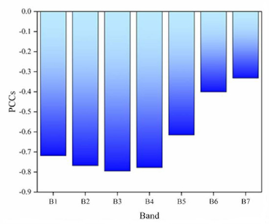 Pearson correlation coefficients between seven single-bands and chlorophyll-a concentration in Figure 3 show that there is a negative correlation between chlorophyll-a concentration and single-band value. In addition, five of the seven single-bands exist strong correlation (0.6 < |PCCs| < 0.8 ) with chlorophyll-a concentration, and the band with largest correlation is B3 (PCCs 0.7957 ). The other two bands are B6 (PCCs 0.4007) and B7 (PCCs 0.3319 ) which have a weak correlation with chlorophyll-a concentration. However, the lowest absolute value of correlation is greater than 0.3, which indicates that chlorophyll-a concentration has a certain correlation with the whole seven single bands.