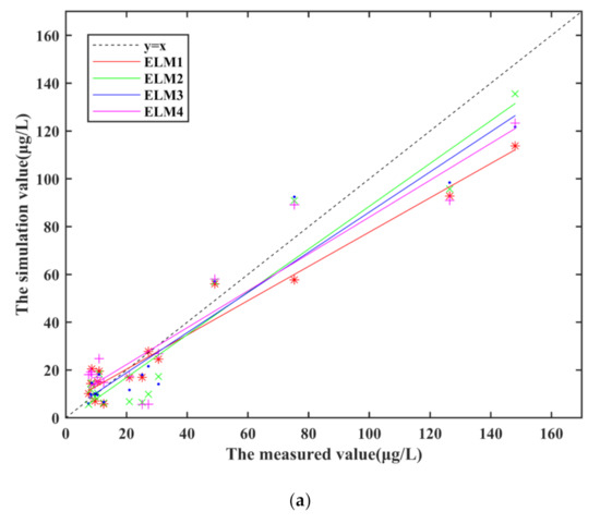 The simulation results of four ELM models and the measured values of chlorophyll-a concentration are shown in Figure 5a. The simulation results of the four ELM models vary with the measured values, and the simulation results of the ELM2 match better with the measured values than other three ELM models.
