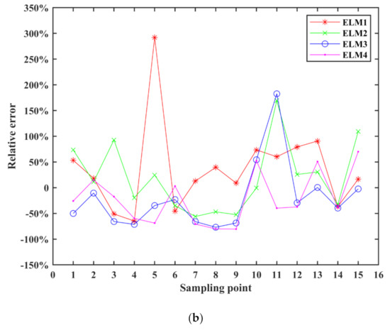 Modeling simulation results (a) and relative error (b) of ELM models.