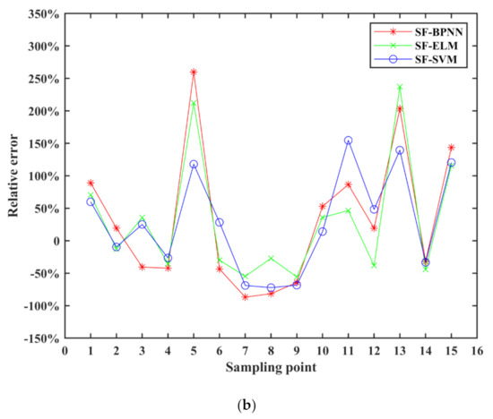 At the same time, the relative error of the SVM model in Figure 6b is not large in general. Only the relative errors of one point of SVM1 and four points of SVM4 are beyond the acceptable range, but they are all less than 1.5. Furthermore, both SVM2 and SVM3 show good simulation result. MRE of the four SVM models can reach 10.78%, −9.89%, −4.25% and 29.52%, respectively, which achieves a good effect. Compared with other three SVM models, SVM3 work better.