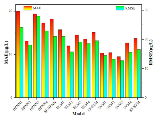 The same phenomenon happens when the simulation accuracy of the same algorithm model is compared. The MAE and RMSE of SF-BPNN, SF-ELM, SF-SVM are 18.84 μg/L and 27.16 μg/L, 13.81 μg/L and 21.55 μg/L, 11.52 μg/L and 15.90 μg/L, respectively. As the result display the MAE and RMSE of the single-factor model are at the middle level in those models used the same algorithm, in other words, the test result error of the single-factor models is acceptable, but also can be improved. All in all, although single-factor modeling is effective, multi-factor dataset for modeling has the possibility to improve the accuracy of the model, and the multi-factor inversion model is worth exploring and using.