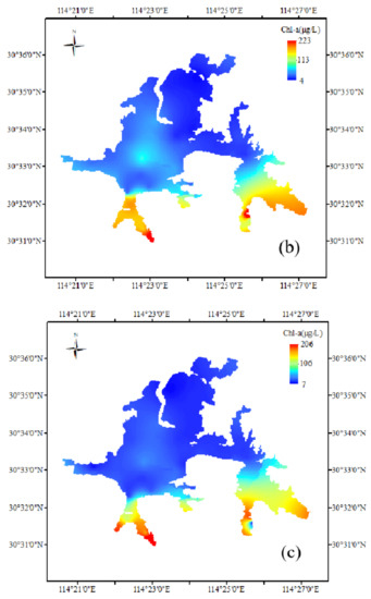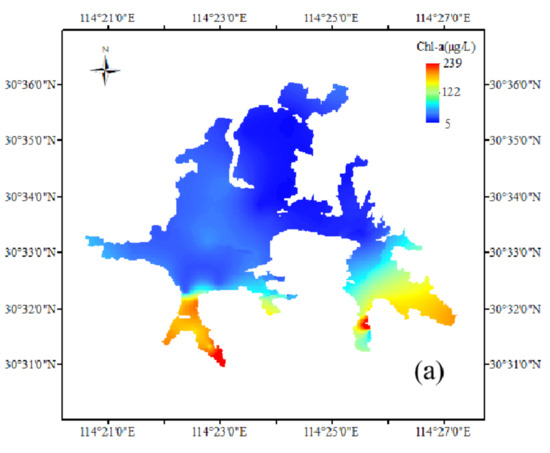 Both the three maps reflect that the concentration of chlorophyll-a in Miaohu Lake, Houhu Lake, Yujia Lake and Lingjiao Lake is very high. The three lakes have the same geographical location characteristic that they are all located near densely populated areas, such as schools, residential areas and scenic spots, and they all have a small area, a long coastline, sluggish flow. They receive a large amount of domestic sewage containing nitrogen and phosphorus from the surrounding sewage outlets, however, the pollutants are not easy to diffuse and transfer, which leads to serious local eutrophication. The Houhu Lake is relatively large, but the lake has shallow water level, many bays, long shorelines, and dense surrounding residents. In addition, a large amount of domestic sewage and farmland irrigation wastewater are discharged into the lake, which leads to non-point source pollution and a heavy eutrophication load. Therefore, the concentration of chlorophyll-a in these lakes is relatively high. However, the chlorophyll-a concentration distribution map also has some parts that are not completely consistent with the actual situation of Donghu Lake. For example, the water quality of Shuiguo Lake and the southwest coast of Guozheng Lake have been eutrophic affected by the surrounding environment, and it has not been reflected in the distribution maps. This is mainly due to our insufficient number of sampling points, and most of the sampling points are set in the area with good water quality where are far from the shore.