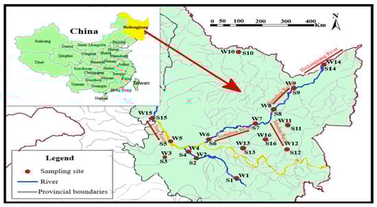 Thirty-two river water and 54 sediment samples were gathered in 6 months, establishing from June till December 2017, comprising summertime and winter seasons in the year. The 16 water and sediment testing sites (S1–S16 and W1–W16) were chosen involving the form of anthropogenic input (upstream and downstream of specific high, medium, and small cities; Figure 1 and Table S1 in Supplementary Materials). The surface sediment samples were collected from a depth of 0–20 cm. The technique for accumulating sediment and water samples was once mentioned in our earlier research [18]. In summary, 1 L for each water sample gathered at testing sites was put into amber glass bottles and were capped with Teflon-lined caps. Samples were (i) transformed with hydrochloric acid (pH 2–3) and (ii) then stored at 4 °C in darkness. The surface sediment samples ranging from 0 to 10 cm were (i) tacked and saved in aluminum containers, (ii) then freeze-dried, and (iii) finally stored in darkness at −20 °C. All samples were transmitted to the Laboratories of the International Joint Research Center for Persistent Toxic Substances for analyses.