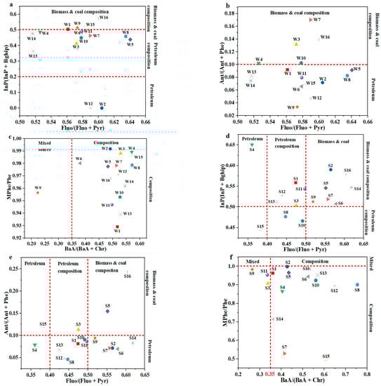 Diagnostic ratios of PAHs were established for demonstrating PAHs composition and the substantial source [37] plot of BaA/(BaA + Chr) > 0.35, Fluo/(Fluo + Pyr) > 0.5, InP/(InP + BghiP) > 0.5, Ant/(Ant + Phe) > 0.1, thus conducted to coal or biomass. Moreover, PAHs defined as petroleum sources are recognized by BaA/(BaA + Chr) < 0.2, InP/(InP + BghiP) < 0.2, Fluo/(Fluo + Pyr) < 0.4, and Ant/(Ant + Phe) < 0.1 [38]. Moreover, MP/P ratio sum of (3-MPHEN +2-MPHEN +1-MPHEN/PHEN + 9-MPHEN) < 1, pyrogenic source and ˃2.0 signifies petrogenic, and 1–2, mixed sources [39]. In river water, the plots of Fluo/(Fluo + Pyr), Ant/(Ant + Phe), and InP/(InP + BghiP) were varied from 0.02 to 0.1, 0.0 to 0.2, and 0.2 to 0.5, observing petroleum origin, among the 16 sampling sites, 10 were suggested to be afected by petroleum sources (Figure 2a–c). Among the sites influenced by petrogenic sources, W6 and W5 were situated in industrial and commercial areas. Additional plots of Fluo/(Fluo + Pyr), InP/(InP + BghiP), Ant/(Ant + Phe), MPhe/Phe, and BaA/(BaA + Chr), ranged from 0.5 to 0.9, 0.5 to 0.6, 0.1 to 0.18, 0.35 to 0.6, and 0.9 to 1, appearing as a source biomass and coal composition; all 16 sampling sites, were suggested to be affected by biomass and coal composition sources, except W9 was affected by mixed source (Figure 2a–c). For sediment, the values of Fluo/(Fluo + Pyr), InP/(InP + BghiP), and Ant/(Ant + Phe) varying from 0 to 0.4, 0.4 to 0.5, and 0.45 to 0.5, suggesting petroleum source composition; among the 16 sampling sites, nine were suggested to be affected by petroleum sources, except (S2, S5, S6, S7, S9, S14, S16) were affected by biomass and coal (Figure 2d–f). Additional ratios of Flu/(Flu + Pyr), InP/(InP + BghiP), Ant/(Ant + Phe), BaA/(BaA + Chr), and MPhe/Phe were varied from 0.5 to 0.6, 0.5 to 0.65, 0.1 to 0.25, 0.35 to 0.8, and 0.5 to 1, verifying biomass and coal composition, as displayed in Figure 2d–f. In this research, we conditionally named PAHs and Me-PAHs sources in isomer ratios. The results from diagnostic ratios indicated that all PAHs and Me-PAHs in the sampling area mainly were relevant to either petrogenic or pyrogenic origin.