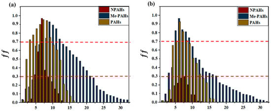 The calculation showed a different exchange pattern between sediment and water during the winter and summer seasons for these chemicals. The summer values of ff were above 0.7 for much more than 68% HMW PAHs as well as 59% for Me-PAHs, in which benzo[b]fluorantheen, chrysene, benzo[k]fluoranthene, pyrene, and benzo[g,h,i]perylen were the most abundant of PAHs. The previous study reported similar results for HMW PAHs [19]. For Me-PAHs, the ff values of 3,9-Dimethylbenzaanthracene, 7,9-Methylbenzaanthracene, 5,8-Dimethylbenzocphenanthrene, and 7,12-Dimethylbenzaanthracene were all >0.7, this indicating that surface sediment acted as the secondary source to river water [5], as shown in Figure 3. During summer, the ff values were between 0.3 and 0.7 for more than 37% LMW, 2,2′-Dinitrobiphenyl, 9-Nitroanthracene, 9,10-Dinitroanthracene, and 2-Nitrobiphenyl, suggesting that they were in equilibrium between water and sediments. PAHs ff values were higher in the summer than their parent PAHs, probably due to the levels of pollution from HMW PAH as well as the increase in sediment organic carbon content [43]. Other locations discovered the same conclusion [18]. In winter, average ff values of LMW Phenanthrene, Anthracene, and Fluoranthene were larger than 0.7, equivalent for Me-PAHs, such as 2-Methylnaphthalene, 1-Methylphenanthrene, 1-Methylanthracene, and 9-Methylanthracene, which suggests that these LMW PAHs and Me-PAHs acted as the secondary source to river water. Whereas, the chemical compounds with average ff values decrease more than 0.3 in winter, consisting of Indeno[1,2,3-cd]pyrene, Dibenz[a,h]anthracene, Benzo[g,h,i]perylene, 2-Nitrobiphenyl, 4-Nitrobiphenyl, 5-Nitroacenaphthene, 2-Nitronaphthalene, 2,2′-Dinitrobiphenyl, and 9-Nitroanthracene, suggesting the net fluxes of PAHs and NPAHs, from water to sediment. It is shown that PAHs and Me-PAHs values of ff diminished with lowering of PAHs and Me-PAHs rings and growing with their rings in each season (Figure 3). Differences are located in plots of water–sediment equilibrium in the course of winter and summer seasons for PAHs, Me-PAHs, and NPAHs homologs. The net impact after transport of LMW PAHs, Me-PAHs, and NPAHs for the duration of the winter seasons act as principal and secondary sources, and switch of HMW throughout the summer seasons acting as secondary and equilibrium sources was achieved, whereas the secondary sources were dominant in the summer seasons.