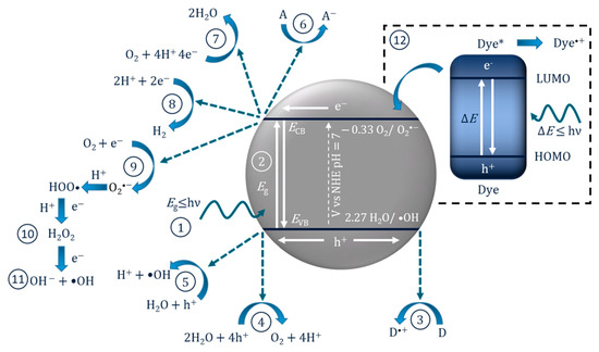 The removal of dyes from wastewater is challenging and of major environmental concern as an estimated 700,000 tonnes are produced yearly and after use are discarded into water bodies, often without any post-treatment [15]. Consequently, testing for the degradation of dyes and other photosensitive compounds has been conducted [16,17,18,19]. This is partly because it is a simple and low-cost method of testing new photocatalytic materials. However, if the excitation wavelengths of the irradiation source overlap with the absorption spectrum of the dye, a different mechanism can take place (Figure 1(12)), where the dye can become photoexcited and inject an electron into the conduction band of the semiconductor (SC), and, in the process, the dye is oxidised [20]. The injected electron in the SC can then result in a reductive reaction if the conduction band edge has a suitable potential and can result in the formation of , which can lead to further degradation of the dye. These reactions can be expressed as Equations (1)–(5).