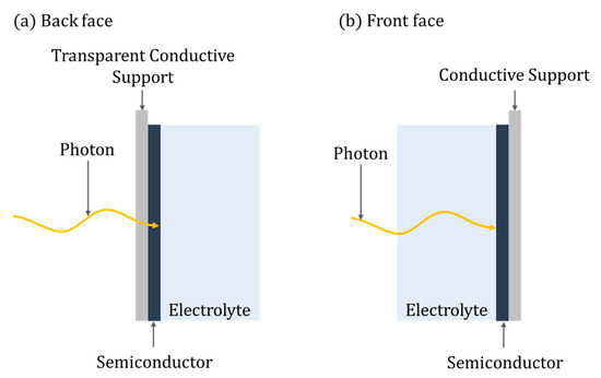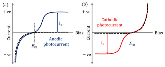 In PECs, the photoanode is normally an n-type semiconductor (electrons are the majority carriers) as these materials exhibit anodic photocurrents (Figure 2a), while p-type materials (holes are the majority carriers) display cathodic photocurrents (Figure 2b) and therefore are used as photocathodes; thus, a photocurrent is only observed when the minority charges are involved [29]. Photocathodes (p-type) have had less attention in the literature as compared to photoanodes due to instability in aqueous environments under irradiation, and due to self-reduction, e.g., Cu2+ to Cu [30] or self-oxidation, e.g., Cu2O to CuO [31].