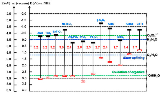 Bandgap and band edge potentials for different semiconductors. (Reproduced with permission from [37]: Kumar, S.; Karthikeyan, S.; Lee, A. g-C3N4-Based Nanomaterials for Visible Light-Driven Photocatalysis. Catalysts 2018, 8, 74, doi:10.3390/catal8020074. Copyright (2018), MDPI (Basel, Switzerland)).