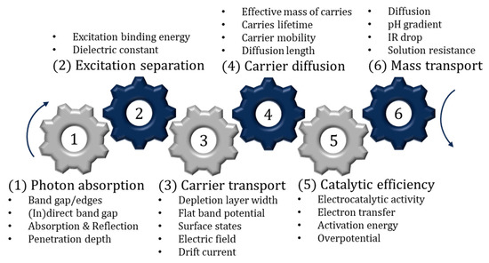 Having suitable band edges is only one important factor. The semiconductor must also be photoactive and (electro)chemically stable in aqueous environments. It is also important to address the internal mechanism, to further explain the limiting factors of the material and therefore offer insights into how best to improve the semiconductor. The sequential internal mechanism (photon absorption, separation, charge transport/diffusion, catalytic efficiency and mass transport) has been compiled in a review by Takanabe [38] and is summarised in Figure 5. One aspect not included in the review is the growing area of crystal facet engineering, as the photocatalytic activity, surface absorption, surface energy and the valence band have been reported to vary between facets on a single crystal; thus, it is of interest to increase the area of the more effective facets. Further information on facet engineering and perspectives can found in the review by Tu et al. [39].