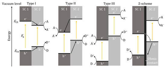Band edge positions and electron/hole movement for type I, II and III heterostructures and z-scheme. SC—semiconductor, A—electron acceptor, D—electron donor, e−—electron, h+—hole.