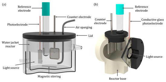 For back-face irradiated electrodes, an alternative design can be used such as the stirred tank reactor used by McMurray et al. [56]. It enables the maximum irradiation to be absorbed by the photocatalyst film, and a stainless steel propeller was used for both mixing and as the counter electrode by using a carbon bush to make an electrical contact. Alternatively, a more traditional photoelectrochemical cell, as shown in Figure 8b, can be used for electrochemical analyses.