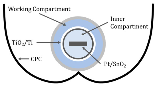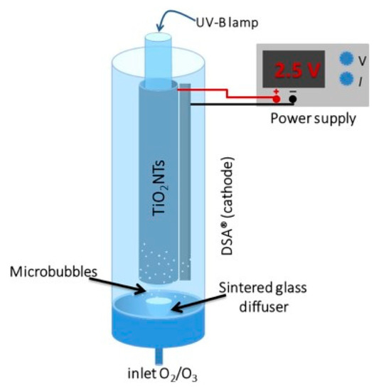 Schematic representation of the PEC annular bubble column reactor. (Reproduced with permission from [47]: Kim, J.Y.U.; Bessegato, G.G.; de Souza, B.C.; da Silva, J.J.; Zanoni, M.V.B. Efficient treatment of swimming pool water by photoelectrocatalytic ozonation: Inactivation of Candida parapsilosis and mineralization of Benzophenone-3 and urea. Chem. Eng. J. 2019, 378, 122094; DOI:10.1016/j.cej.2019.122094. Copyright (2019), Elsevier (Amsterdam, The Netherlands)).