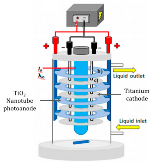 The cylindrical design of Montenegro-Ayo et al. [63] used titanium discs which were anodised to produce a titania nanotube array, the counter electrode was unmodified titanium discs and the irradiation source was a 14 W UVC lamp (275 nm). A schematic of the reactor is presented in Figure 11. The reactor was tested for the degradation of acetaminophen (10 mg L−1) in 0.02 M Na2SO4. Different applied cell biases were examined (0, 4, 8, 16, 32, 64 V) and, at +8.0 V, there was a 95% reduction after 5 h when operated under irradiation compared to 3% for only electrolytic and 72% for photocatalytic degradation (open circuit). Increasing the applied bias >+8.0 V did not offer a significant improvement in the rate but did significantly increased the energy requirement.