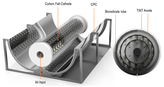 PEC reactor configuration with CPC. (Reproduced with permission from [67]: McMichael, S.; Waso, M.; Reyneke, B.; Khan, W.; Byrne, J.A.; Fernandez-Ibanez, P. Electrochemically assisted photocatalysis for the disinfection of rainwater under solar irradiation. Appl. Catal. B 2021, 281, 119485, doi:10.1016/j.apcatb.2020.119485. Copyright (2021), Elsevier Elsevier (Amsterdam, The Netherlands)).