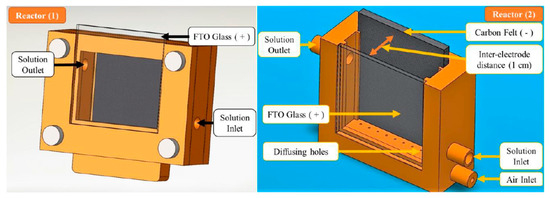 Reactor (1) air bubbled in a separate tank, Reactor (2) air bubbled directly into reactor. (Reproduced with permission from [68]: Mousset, E.; Huang Weiqi, V.; Foong Yang Kai, B.; Koh, J.S.; Tng, J.W.; Wang, Z.; Lefebvre, O. A new 3D-printed photoelectrocatalytic reactor combining the benefits of a transparent electrode and the Fenton reaction for advanced wastewater treatment. J. Mater. Chem. A 2017, 5, 24951–24964, doi:10.1039/c7ta08182k. Copyright (2017), Royal Society of Chemistry Publishing (Cambridge, UK)).
