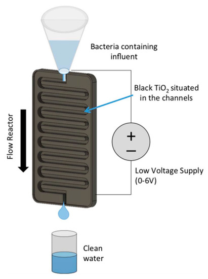 Schematic of a channel reactor using titanium nanotubes annealed in 2% hydrogen. (Reproduced with permission from [70]: Carlson, K.; Elliott, C.; Walker, S.; Misra, M.; Mohanty, S. An effective, point-of-usewater disinfection device using immobilized black TiO2 nanotubes as an electrocatalyst. J. Electrochem. Soc. 2016, 163, H395–H401, doi:10.1149/2.0651606jes. Copyright (2016), IOP Publishing (Bristol, UK)).