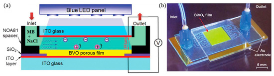 (a) Cross-sectional view of the reaction chamber, (b) photo of the PEC microreactor. (Adapted with permission from [49]: Wang, N.; Zhang, X.; Chen, B.; Song, W.; Chan, N.Y.; Chan, H.L.W. Microfluidic photoelectrocatalytic reactors for water purification with an integrated visible-light source. Lab Chip 2012, 12, 3983–3990, doi:10.1039/c2lc40428a. Copyright (2012), Royal Society of Chemistry Publishing (Cambridge, UK)).