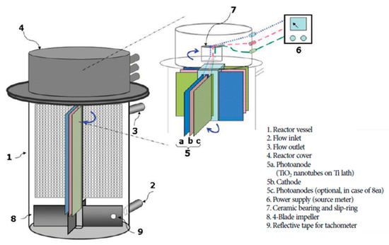 Rotational reactor using titanium nanotube photoanode and titanium cathode. (Adapted with permission from [78]: Cho, H.; Seo, H.S.; Joo, H.; Kim, J; Yoon, J. Performance evaluation of rotating photoelectrocatalytic reactor for enhanced degradation of methylene blue. Korean J. Chem. Eng. 2017, 34, 2780–2786, doi:10.1007/s11814-017-0198-7. Copyright (2017), Springer Nature (Seoul, Korea)).