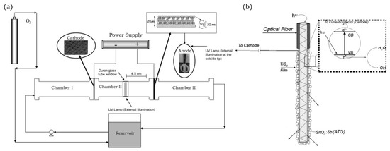 (a) Schematic representation of the experimental set-up, (b) fibre optic photoanode. (Adapted with permission from [85]: Esquivel, K.; Arriaga, L.G.; Rodríguez, F.J.; Martínez, L.; Godínez, L.A. Development of a TiO2 modified optical fiber electrode and its incorporation into a photoelectrochemical reactor for wastewater treatment. Water Res. 2009, 43, 3593–3603, doi:10.1016/j.watres.2009.05.035. Copyright (2009), Elsevier (Amsterdam, The Netherlands)).