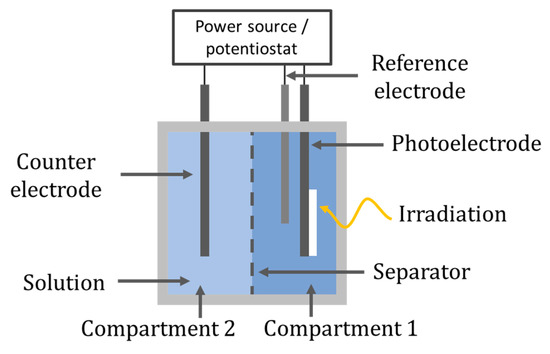 When the photocatalyst is used as a powder suspension for water treatment, post-processing is required to remove the photocatalyst from the treated solution. While possible, this adds extra cost and complexity to the system. To avoid this problem, immobilising the photocatalyst onto a substrate has been studied [23]; however, immobilisation reduces the specific surface area in contact with the solution and introduces a mass transport problem to the system, meaning immobilised systems are typically less effective than suspension systems [24]. Photocatalytic materials may also exhibit short electron–hole lifetimes (i.e., fast recombination) and low mobility, in which the diffusion length of the electron is normally larger than the diffusion length of the hole [25]. Therefore, the application of an external electrical bias in PECs can be used to overcome these problems.