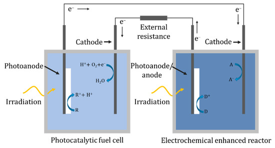 The current water crisis affects billions of people globally due to the lack of access to a safe source of drinking water (2 billion people), water scarcity (1.9 billion people) and water storages (2.55 billion people) [1,2]. Coupled with the world’s increasing population and wealth, there will be an increasing demand for water industrially, agriculturally and domestically, leading to further increases in freshwater withdrawals and, as the effects of climate change alter our environment, more countries will become water stressed [3]. Consequently, now and in the coming years, how we use and treat water, greywater and wastewater will become more important. Furthermore, there is the added complexity of removing priority substances and contaminants of emerging concern (organic micropollutants) which urban wastewater treatment plants are not designed for [4]. Therefore, there is the need for new water treatment technologies, whether for isolated communities, treating greywater before secondary use or wastewater (municipal or industrial) treatment before being discharged into water bodies. A suitably designed photoelectrocatalytic (PEC) reactor is one potential solution, and if necessary, this can be combined with other technologies to produce a multi-step water treatment system. The term “photoelectrocatalysis” is stated in the IUPAC Recommendations 2011 as “electrochemically assisted photocatalysis. The role of the photocatalyst is played by a photoelectrode, often a semiconductor” [5]. Therefore, before examining PEC reactors, it is beneficial to first understand the principles of photocatalysis.