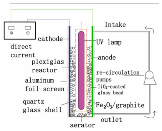 - An, T.; Zhu, X.; Xiong, Y. Synergic degradation of reactive brilliant red x-3b using three dimension electrode-photocatalytic reactor. J. Environ. Sci. Health A 2001, 36, 2069–2082. [Google Scholar] [CrossRef]