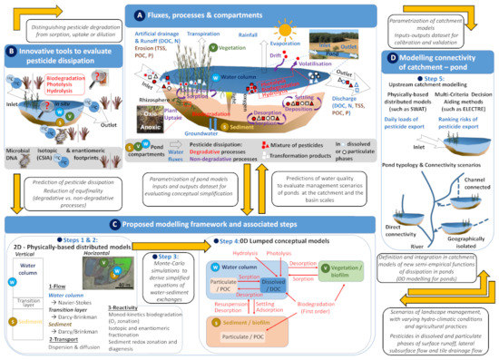 Evaluation and prediction of pesticide dissipation in ponds and the role of ponds at the catchment scale. (A) Fluxes, processes and compartments of ponds. (B) Innovative tools to distinguish pesticide degradative and non-degradative processes. (C) Pond modelling framework sketched in this review and associated steps. (D) Modelling the catchment–pond connectivity to integrate the cumulative effect of ponds in terms of risks of pesticides transfer and fluxes at the catchment scale and elaborate management scenarios. TSS: total suspended solids; DOC: dissolved organic carbon; N: nitrogen; P: phosphorus; POC: particulate organic carbon.