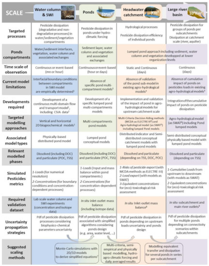 Concerning the development of an integrative modelling framework of pesticide transfer at the catchment scale including the role of ponds, this review underscores two issues that have not been answered yet. First, it is required to improve the implementation and parametrization of pesticide dissipation from the sediment-water interface of the pond, and from the pond or a set of ponds up to the catchment and the river-basin. Second, specific attention should be paid to consolidate conceptual simplifications of pesticide dissipation across scales.