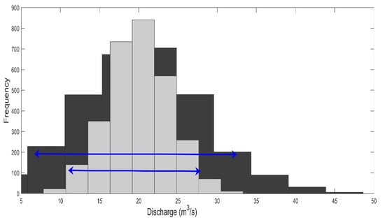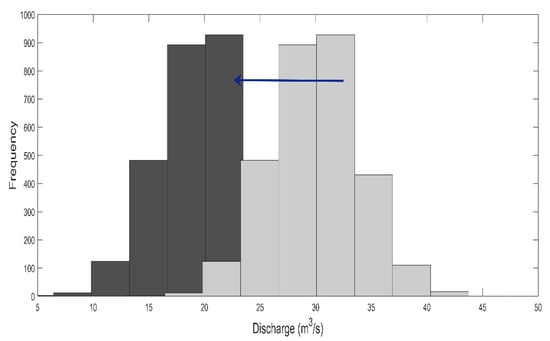 Figure 1. In the context of climate change, the shape of the histogram will likely be altered in many ways. Firstly, the non-stationarity of order 1 may involve a trend or shift in the mean. In time, this can result in a full translation of the histogram of daily flows to the right (i.e., the average flow will increase) or the left (i.e., the average flow will decrease).