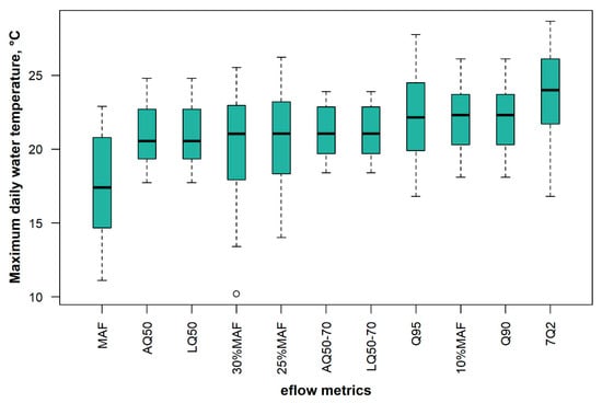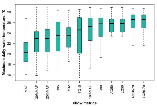 Figure 5 shows an example of maximum temperature variability in one of the hydrometric stations (01EF001) on the LaHave River in Nova Scotia (Canada). It clearly shows that AQ50 and AQ50-70 produce higher maximum water temperature and less variability than the rest of eflows because the associated events occurred in August, a warm summer month. For this station, the AQ50 and LQ50 are identical because August corresponds to the month with the lowest discharge.