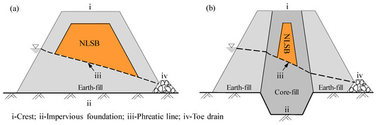Schematic of termite control by using NaCl-laden soil barrier (NLSB). (a) In a homogeneous embankment; (b) in a zoned embankment.