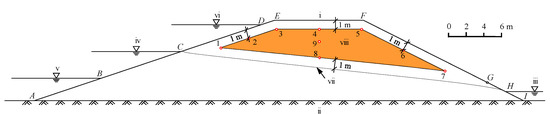 Schematic of NaCl-laden soil barrier, including initial hydraulic and boundary conditions used during simulations. (i) Crest; (ii) impervious foundation; (iii) tail water level; (iv) normal water level (NWL); (v) initial water level (IWL); (vi) high water level (HWL); (vii) phreatic line at NWL; (viii) NaCl-laden soil. Positions of observation points (1–9) are marked by red circles.