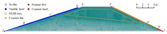 The model domain has a trapezoidal geometry, as illustrated by the cross section AEFIA in Figure 3, demonstrating the physical conditions. AB, AC, and AD depict the upstream area during the dry, normal, and rainy seasons, respectively; AI represents the impervious foundation; EF, GH, and HI represent the embankment crest, seepage face, and tail water area, respectively; and the NLSB area is enclosed in orange. By using the Meshgen tool in the HYDRUS software package, the region was discretized into 2D triangular elements. Each mesh contained approximately 7200 nodes and 14,000 triangular elements. The finite element mesh and boundary conditions of the earth embankment with NLSB are shown in Figure 3.