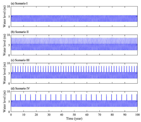 The water level fluctuations in Scenario III are shown in Figure 4c, which displays one normal year followed by one wet year, with 50 cycles and a total simulation period of 100 years. The water level fluctuations in Scenario IV are shown in Figure 4d, which presents three normal years followed by one wet year, with 25 cycles and a total simulation period of 100 years.