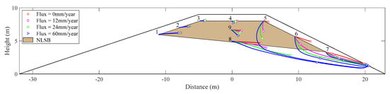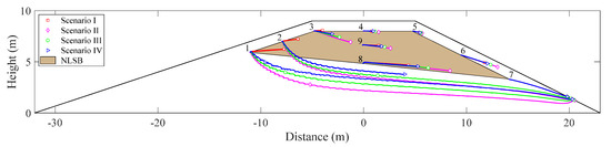 A no flow boundary was selected along FG (in Figure 3) during simulations for scenarios I–IV. Nine observational positions of flowing particles were set in the calculation domain of NLSB, as shown in Figure 2. Among them, observation Points 1–3 were on the boundary line of NLSB near the upstream slope, observation Points 5–7 were positioned on the boundary line of NLSB near the downstream slope, and observation Points 4, 9, and 8 were positioned on the axis with distance = 0 m. The particle-tracking method was used to calculate the trajectories of moving particles with time. Figure 5 depicts the trajectories of flowing particles under different water levels.